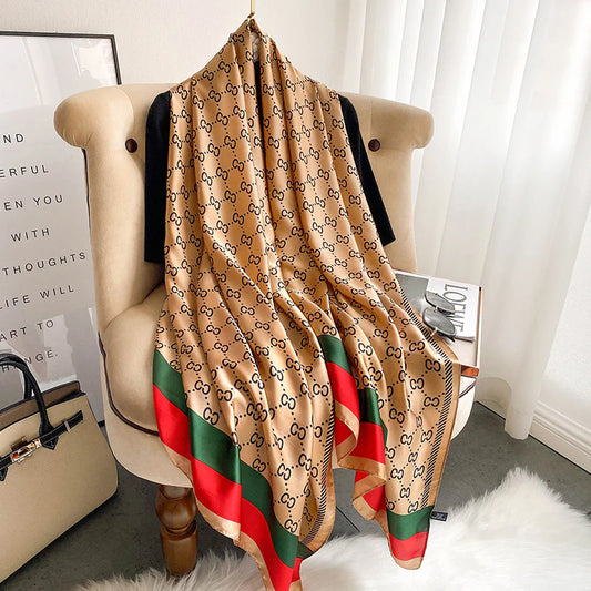 Luxury Champagne & Black Monogram Silk-Feel Satin Scarf with Red & Green Stripe – 90 x 180 cm
