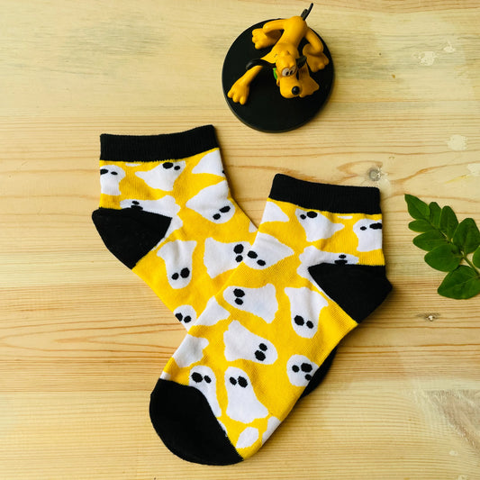 Goofy Ghosts Ankle Socks – Quirky Yellow & Black Design | Lazzy Socks India