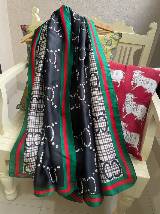 Luxury Black Monogram & Abstract Graphic Silk-Feel Satin Scarf with Red & Green Stripe – 90 x 180 cm