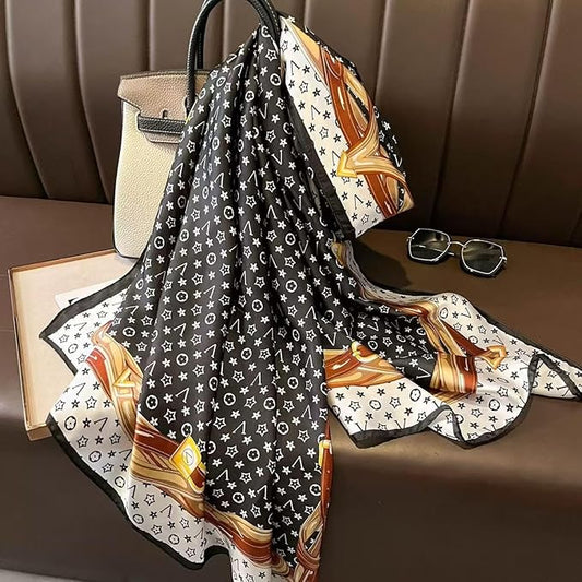 Luxury Black & White Monogram Silk-Feel Satin Scarf – 90 x 180 cm