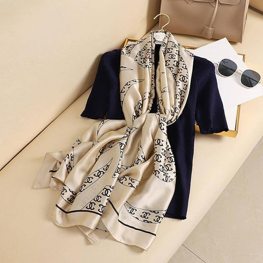 Luxury Cream & Black Monogram Chain Silk-Feel Satin Scarf – 90 x 180 cm