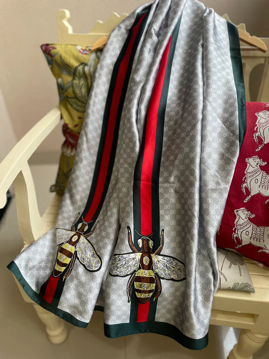 Luxury Light Grey Monogram & Bee Silk-Feel Satin Scarf with Red & Green Stripe – 90 x 180 cm