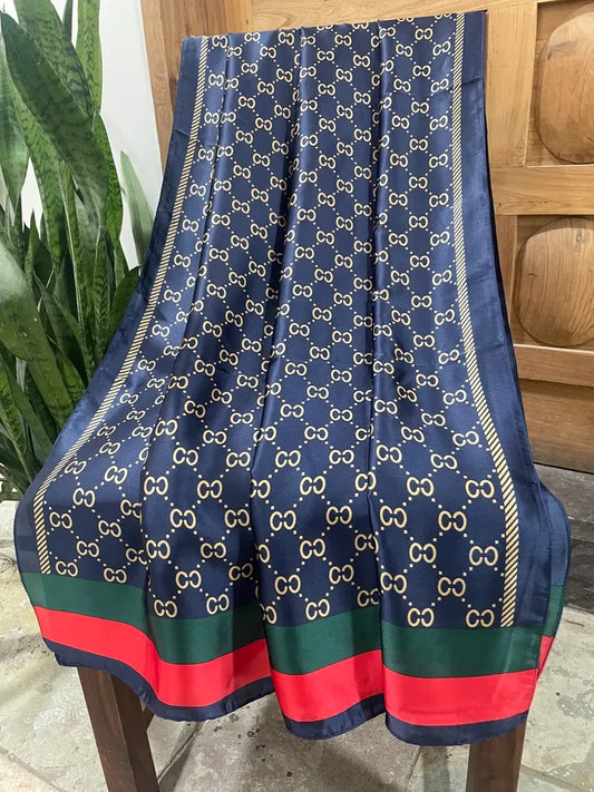 Luxury Navy Blue & Gold Monogram Silk-Feel Satin Scarf with Red & Green Stripe – 90 x 180 cm